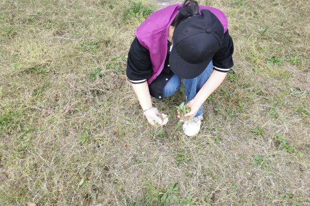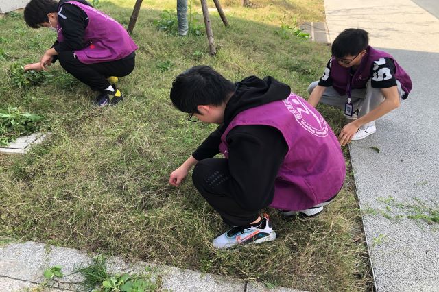 活动当天,艳阳高照、酷暑难耐,但丝毫没有抵挡志愿者们的劳动热情。下午一点半,工作人员在目的地集合完毕,便迅速带上工作手套、铁锹,以饱满的热情和高昂的情绪投入到拔草行动中。大家分组、分区进行劳动,铲草、清理杂物、修剪盘在树上的野草、将垃圾运到指定地点。虽然同学们的脸上不停淌下大粒的汗珠,身上的工作服也都浸湿了,但是没有人停下来歇息,直到原本长满杂草的场地变得干净、美观。