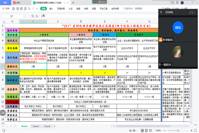 2022年6月21日、22日两天时间,通过陆教授和电子信息工程技术专业团队教师交流“电子信息工程技术专业项目化教学构建”方案,大家基于专业人才培养目标积极讨论专业课程设置及其对应的“三级项目”,最终形成了专业项目化教学改革的一图两表,即电子信息工程技术专业项目化教学体系鱼骨图、课程教学安排一览表和项目化课程一览表,设置的三级项目为:三级项目2个“电表制作与改装、直流可调稳压电源”,二级项目1个“水果采摘器”,一级项目1个“智能消毒小车”。