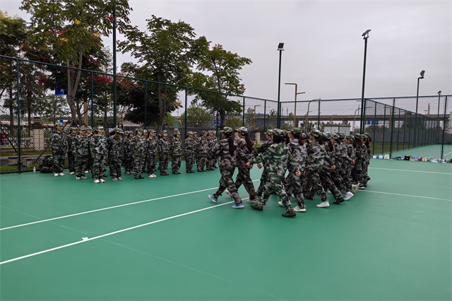 凉爽多云的天气为同学们的训练供给了不少便利,绿茵茵的青草和橄榄绿的迷彩军装相互辉映,让同学们显得活力十足。