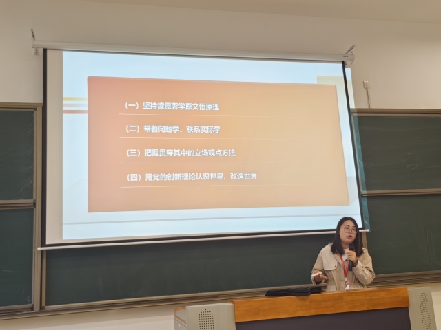 11月7日下午3:20,电子工程系党支部全体党员在勤学楼102开展“习近平新时代中国特色社会主义思想”深入学习宣讲。宣讲人为校思政中心老师赵姗姗。