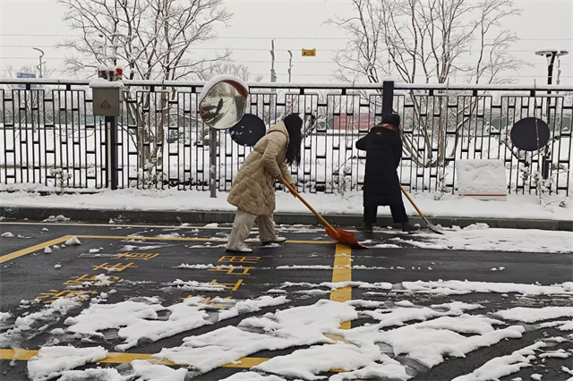 扫雪队成了冬日校园一道独特的风景线。“众人拾柴火焰高”,也就一小时,成果显著。笃行楼、敏行楼和慎行楼中间道路的积雪和冰层全部瓦解,雨雪冲刷之后更显得道路干净。
