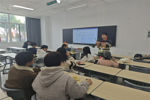活动现场,指导老师禹花宁为同学们讲解了操作流程。接着,同学们围绕“如何精妙包花”开展讨论,大家的思维碰撞出激烈的火花,现场笑声不断,氛围融洽。敲定自己的包花小方案后,同学们拿起花材,手指翻飞,满心期许,要将脑海中的创意化作现实中的精美花束。对于没有思路,不会操作的同学,在老师细致入微的指导下,同学们逐渐掌握了诀窍,也得心应手起来,一朵朵鲜花在他们手中慢慢变身成一束束精美的艺术品,馥郁花香传遍了教室。