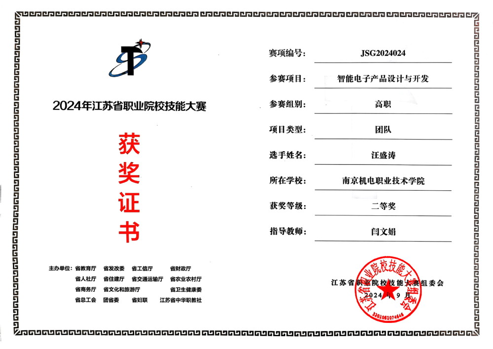 2016届毕业生,在校期间获得“优秀学生干部”、“优秀共青团员”、暑期社会实践“先进个人”、暑期社会实践“先进团队”、校园焊接技能竞赛二等奖、校内微电影等相关比赛一等奖、蓝桥杯大赛江苏赛区电子产品设计与制作组等奖、江苏省高等职业院校技能大赛 电子产品设计及制作项目一等奖、中美青年创客大赛南京赛区三等奖、中美青年创客大赛中美总决赛最佳人气奖、授权实用新型专利一项、2016届优秀毕业生。现就职于南京矽力杰半导体技术有限公司,任BLE应用工程师。