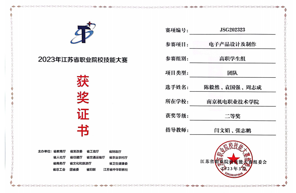 2021届电子信息工程技术专业毕业生,在校期间虚心好学,品学兼优两次荣获国家励志奖学金。曾获得“三好学生”、“优秀共青团员”、双创班“优秀学员”、第二届中英STEAM国际创新大赛“最佳三维设计奖”、第二届全国大学生创新体验大赛“三等奖”、第三届中英STEAM国际创新大赛“一等奖”以及“最佳作品展示奖,申请并授权三项实用新型专利。现就职于南京长峰航天电子科技有限公司,并在2022年度获先进个人称号。