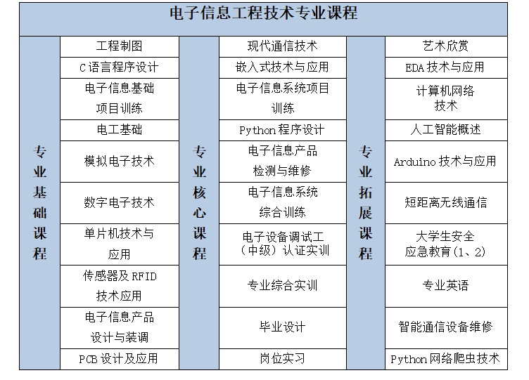 培养德、智、体、美、劳全面发展,掌握电子技术和通信技术的基本知识和产品调测试的基本方法,具备产品软硬件辅助设计、维修、调测试、生产与装配的专业能力,具有批判性思维、团队协作、创新实践等职业核心能力,能从事电子信息产品辅助开发设计、维修、工艺管理、调测试、装配及技术支持等工作的创新性技术技能人才。