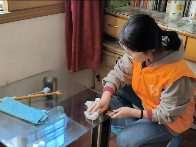 活动中,志愿者们分成若干个小组,分批次地上门拜访独居老人。他们每个人都拿着清洁工具忙碌,有的负责清扫地面,仔细地清扫每一个角落,不放过任何灰尘和杂物;有的整理床铺,将被子叠得方方正正,让床铺看起来整洁又舒适;还有的擦拭家具,从床头柜到桌椅板凳,把家具表面擦得一尘不染。在打扫过程中,志愿者们还会和老人聊聊家常,询问老人的生活习惯,确保在打扫的同时不会弄乱老人常用的物品。过程中,老人们感受到了志愿者们的用心,脸上洋溢着笑容。