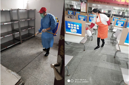 为了保障食品安全,让师生们返校能够吃的安心、吃的健康,后勤处组织员工,提前对食堂内外环境进行全面清洁消毒。