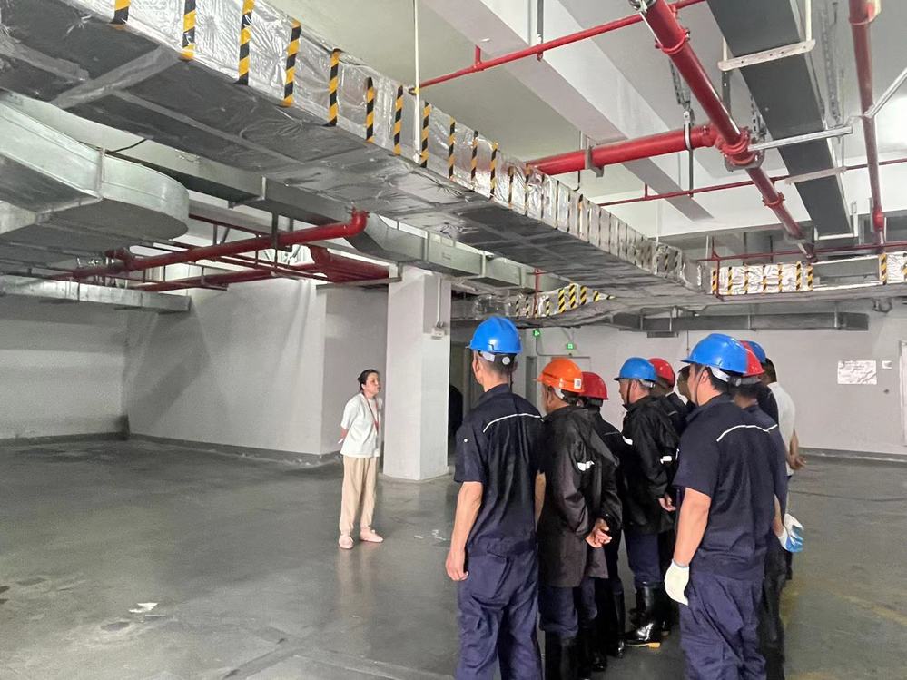 7月6日,地下室模拟暴雨积水倒灌,随时危及生活泵房的正常运行。演练开始,维修人员立即采取措施,调集移动应急抽水泵抽水、搬运应急沙袋垒在坡道处减少雨水倒灌、打开积水处窨井盖排水并在泵房积水排完后及时进行彻底的卫生处理、消毒。