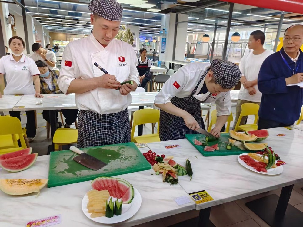 本次比赛设置了包饺子、打菜一勺准、水果拼盘、厨艺大比拼、算账一口清、托盘折返跑六个项目,随着比赛口令各参赛选手大显身手,争先恐后地展示服务技能和服务技巧,比赛现场气氛紧张激烈。