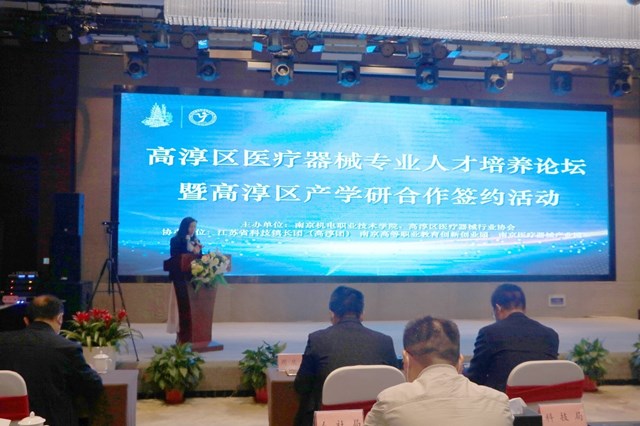 为促进高淳区医疗器械行业产业高质量发展,提高人才培养水平和科技创新能力,进一步服务区域经济发展,2022年5月13日,高淳区医疗器械专业人才培养论坛暨高淳区产学研合作签约活动在高淳区紫荆花园酒店举行。本次论坛及签约活动由米兰官方网页版、高淳区医疗器械行业协会主办,江苏科技镇长团、南京高等职业教育创新创业园、南京医疗器械产业园协办。南京市市场监督管理局二级巡视员蒋永兆,高淳区人民政府副区长张成,副区长刘敏,江苏高淳经济开发区管委会主任杨时平,南京市场监督管理局医疗器械监管处副处长沈洲,南京高等职业教育创新创业园党工委书记刘宜军,高淳医疗器械行业协会理事长江文养,高淳医疗器械行业协会秘书长连儒强,米兰官方网页版党委书记、院长周庆礼,党委委员、副院长刁爱军等领导出席活动,江苏科技镇长团(高淳团)、高淳区市场局、科技局、工信局、人社局、医疗器械园推进办、米兰官方网页版系部领导以及南京医疗器械产业园八家龙头企业等60余嘉宾参与活动。本次活动由科研及校企合作处处长李木香主持。