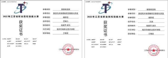 专业团队近三年获得江苏省职业院校教学能力比赛一等奖1项、三等奖1项;技能竞赛获得省级奖项10项;获得南京市有突出贡献技师、南京市技术能手、机电产业集团优秀共产党员、学院优秀教师、优秀共产党员、先进个人等荣誉16项。机械制造及自动化专业学生近三年积极参加各类竞赛,共获得国家级奖项12项,省级奖项60余项。机自专业学生共获得各项荣誉95项,其中省优秀毕业生2人,省三好1人,最美职校生1人。