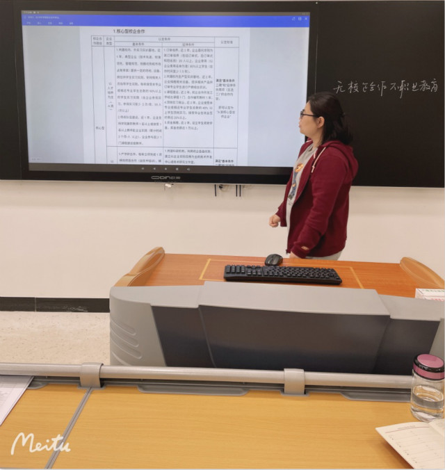 教研活动中,张老师首先带教研室成员认真研读了学院各层级校企合作企业认定的条件:核心型(以人才培养为主的A类、以横向项目合作为主的B类)、紧密型(A类、B类)、半紧密型(A类、B类);其次带成员认真学习了申报与认定表格,明确了填写内容。然后向大家介绍了本专业已认定的合作企业情况:宾科精密部件(中国)有限公司(核心型)、南京旭上数控技术有限公司(半紧密型)。最后和大家一起讨论了十四五期间本专业拟申报的合作企业。