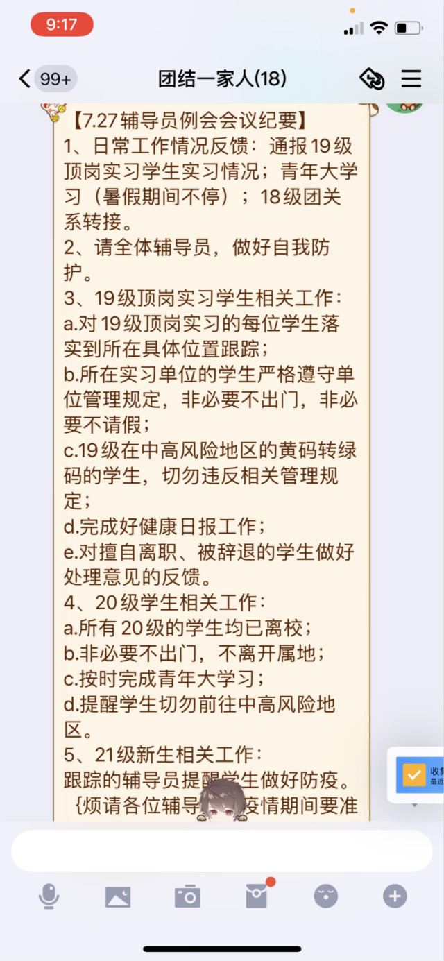 李书记指出,日前,疫情形势严峻,要提醒所有学生做好疫情防护。针对19级顶岗实习学生实习情况进行了通报,要求19级的辅导员做好对学生的定位跟踪,要求所有顶岗实习的学生要严格遵守单位的管理规定,非必要不出门,非必要不离宁。重点关注好中高风险地区的学生,完成好学生的健康日报工作。同时,暑假期间,按时完成“青年大学习”的相关学习要求。对正在跟踪的21级新生也提醒好同学们做好疫情防护。