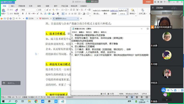 教研活动的第一部分,我们学习了专业现有的人才培养模式(以“一条主线、三项重点、一个学院、三个共建”为思路的“产学深度融合、校企双元育人”人才培养模式),以及会议前收集整理的相关资料,包括人才培养模式的概念(指在一定的现代教育理论、教育思想指导下,按照特定的培养目标和人才规格,以相对稳定的教学内容和课程体系,管理制度和评估方式,实施人才教育的过程的总和),高职院校人才培养模式的构建原则(以人为本的原则、需求导向的原则、特色品牌的原则),高职高专教育人才培养模式的基本特征(根本任务是培养高等技术应用性专门人才;以适应社会需要为目标、以培养技术应用能力为主线,设计学生的知识、能力、素质结构和培养方案;以“应用”为主旨和特征构建课程和教学内容体系;“双师型”教师队伍建设是提高高职高专教育教学质量的关键;“产学三结合”:学校与社会用人部门结合、师生与实际劳动者结合、理论与实践结合),高校与企业产教融合的合作模式(技术合作模式、科技攻关项目模式、现代学徒制模式、职教集团模式、共建实训基地模式、共建二级学院模式),以及高职院校如何创新人才培养模式(以市场需求为导向,以就业为目标;创新教学管理模式和教学组织模式;引导学生创新学习模式和学习方法;提升校园内涵和学生的人文素养;培养高职院校教师的创新精神)等。