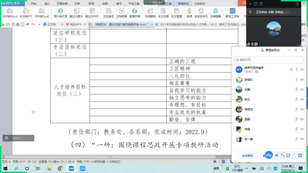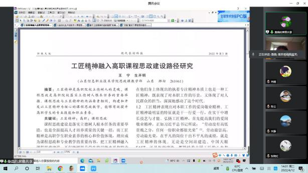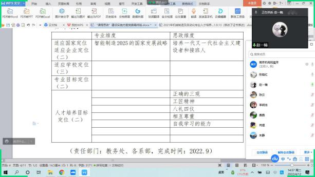 为结合专业特色,将“思政内容”融入专业人才培养方案,2022年4月12日下午,机械制造及自动化教研室全体成员通过腾讯会议召开了主题为“人才培养与思政建设相融合”的教研活动,旨在讨论如何将思政元素融入人才培养方案,本次会议由桑晶老师和陆晨芳老师主持。