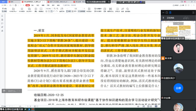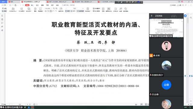 教研会上,连老师首先带大家学习了教育部印发的《职业教育提质培优行动计划(2020—2023 年)》,文件中提出要系统推进职业教育“三教”改革,加强职业教育教材建设。要求教材应对接主流生产技术,注重吸收行业发展的新知识、新技术、新工艺、新方法,校企合作开发专业课教材。提出要根据职业学校学生特点创新教材形态,推行科学严谨、深入浅出、图文并茂、形式多样的活页式、工作手册式教材。接着,连老师带大家学习了新型活页式教材建设的相关论文:《职业教育新型活页式教材的内涵、特征及开发要点》、《职业教育活页式教材开发研究》、《1+X证书制度下高职新型活页式教材的特征、价值与设计》。