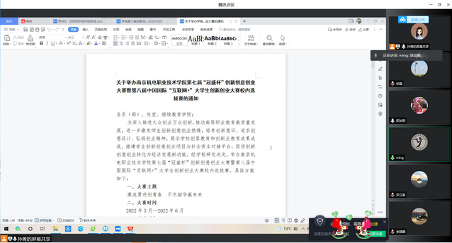 为深入推进大众创业万众创新,推动高等职业教育高质量发展,进一步激发师生创新创意创业热情,培养创新意识、追求创意设计、弘扬创业精神,展示学校创客教育和创新业教育成果成效,搭建学生创新创意创业项目与社会资本对接平台,促进创新创意创业转化为经济发展新动能,学校决定举办米兰官方网页版第七届“冠盛杯”创新创意创业大赛暨第八届中国国际“互联网+”大学生创新创业大赛校内选拔赛。 2022年4月2日上午,机械设计与制造教研室全体老师在腾讯会议线上平台对校内选拔赛具体内容进行学习,会议由教研室负责人孙菁主持。