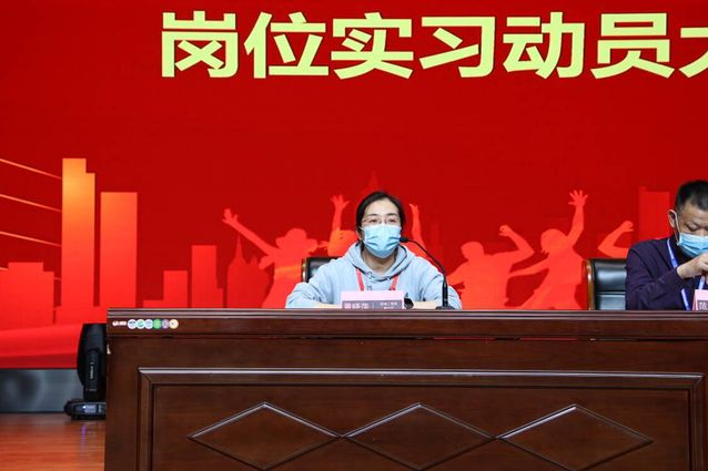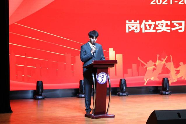 会议在雄壮的国歌声中拉开了序幕,学生代表茅旭升为即将开始的岗位实习发出倡议,辅导员代表王潇然结合自身上学时的实习经历给现场同学做了分享。