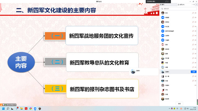 此次讲座从两个方面讲解了新四军教育事业建设:首先总体介绍了新四军文化建设的重要性,其次讲解了新四军文化建设的主要内容。
