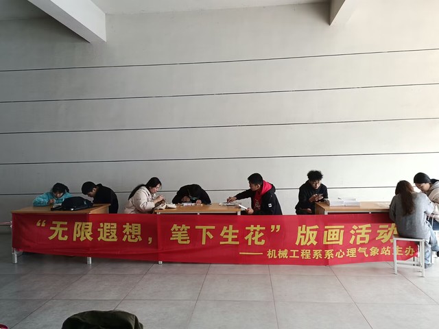 为丰富同学们的校园生活,让同学们感受到与伙伴同行、共同成长的美好,保持良好的心态,在繁忙的学业中也能停下脚步审视自己的内心,2023年3月21日中午12:00,机械工程系心理气象站在食堂前小广场举办了名为“无限遐想,笔下生花”的心理版画活动,吸引了不少同学前来打卡。