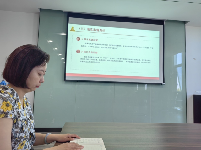 2023年6月27日,机械工程系全体党员在育德楼303集中学习《米兰官方网页版关于加强党员干部“八小时外”监督管理实施办法(试行)》,党支部副书记李杰领读学习该文件精神。