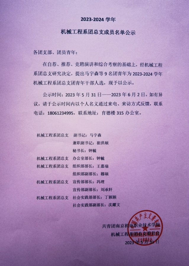 我系团总支于2023年5月25日至5月28日进行了机械工程系团总支第十五届换届选举大会,经第十四届团总支副书记及各部长、副部长商议,确定我系团总支第十五届副书记及各部长、副部长候选人名单,公示名单如下: