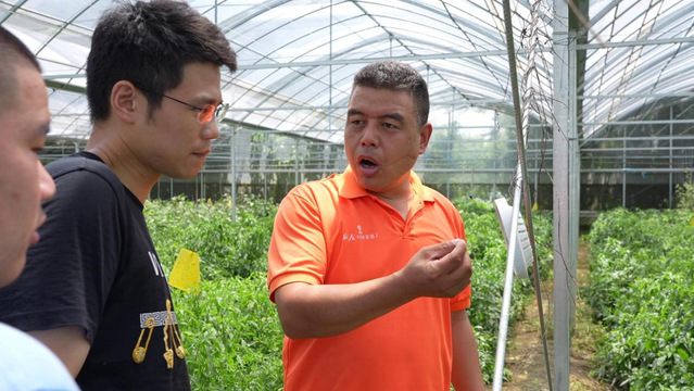 在南京盛庄集团刘姐菜篮子生态农场内,技术人员展示智能化生产系统在种植中的实际应用。这套种植系统可以实时检测大棚内番茄、辣椒、葡萄等果蔬生长情况,只要转动按钮即可轻松实现通风、灌溉、施肥、调温等一系列操作。
