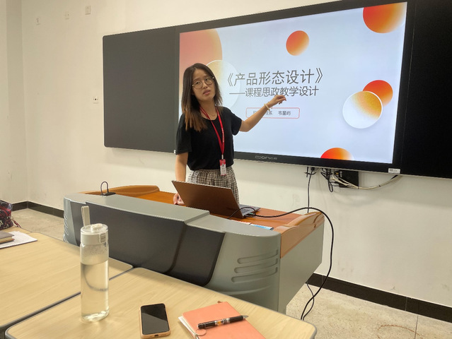 韦星屿老师汇报的是《产品形态设计》课程,她从课程概况、教学设计、教学实施、教学反思与成效四个方面来介绍教学设计过程。课程思政上打造“五融入”的教学模式,即课程目标融入、教学内容融入、教学案例融入、教学实践融入、教学评价融入,帮助学生树立文化自信,提高职业素养。