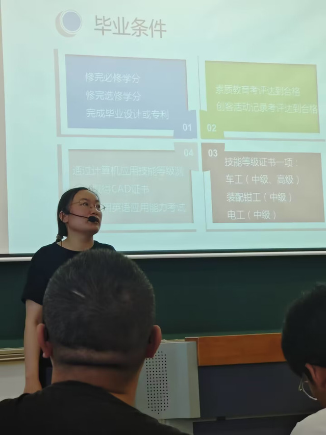 专业介绍会上,桑老师首先对23级新生加入机械制造及自动化专业的大家庭表示热烈欢迎,随后分别从专业定位、专业前景、专业的就业方向、专业所学课程、业余社团、各类竞赛及学历提升等方面进行了全面的介绍,同学们认真聆听学习。