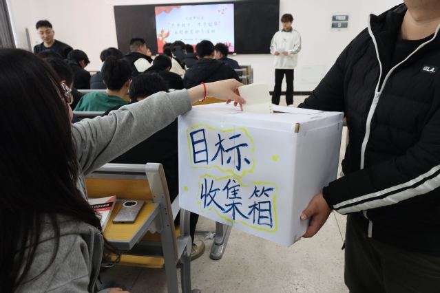 随后,同学们经过认真思考,在笔记本上写下了本学期的目标和实施计划。机制222班班长潘政业同学分享了他的学习目标,希望本学期自己的期末考试成绩能达到专业前三名,并已制定好详细的学习计划。除了充分利用好课堂上的时间,更重要的是珍惜课后的时间,多去自习室学习。而机自233班团支书贺静雯的学习目标是成功竞选团委办公室部长。她擅长文案写作和表格制作,希望能继续在团委大家庭发挥特长,锻炼自己,提升自身的能力。最后,同学们将写好的目标投入到目标收集箱内。等学期末,大家再打开目标收集箱,看个人的目标是否实现。