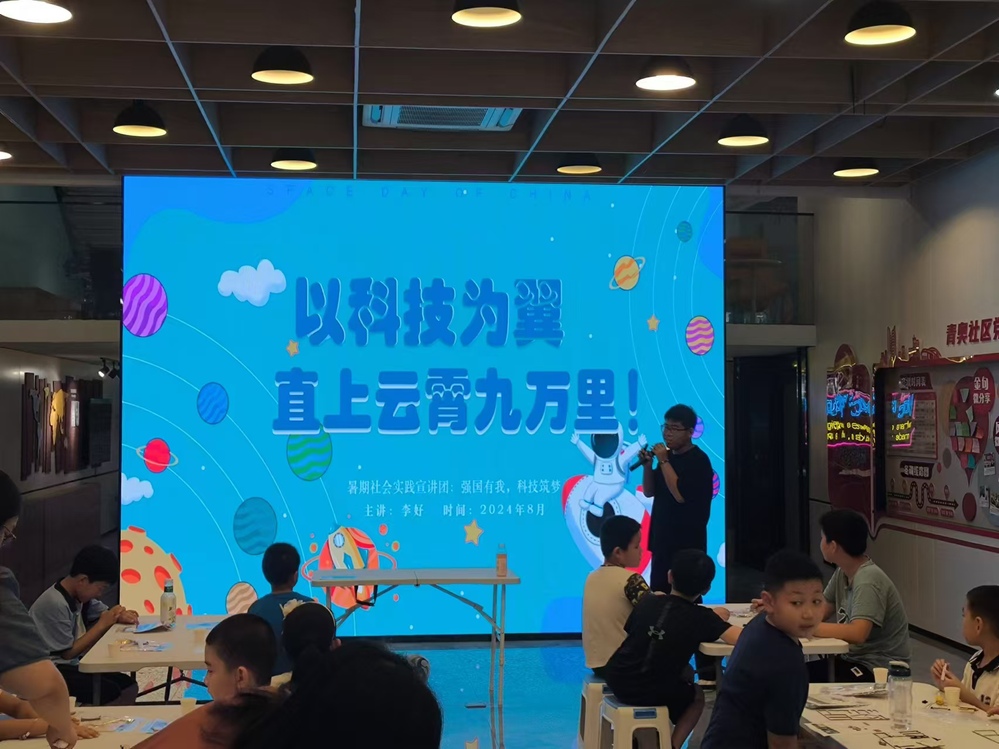 第三站团队前往建邺区双闸街道青奥社区开展航空航天主题的宣讲活动,通过演示文稿的图片和文字加上视频资料为小朋友们讲解了人造卫星,火箭等航空器的原理和作用,现场还设置了丰富多样的互动体验环节,如不定时的互动问答,带领小朋友们模拟空气火箭发射的小实验。活动中,志愿者们协助着小朋友用手工制作的形式完成了每人的趣味模型,有利用太阳能工作的月球探测车,还有可以通过内部安装电池运转的“旋转卫星”。