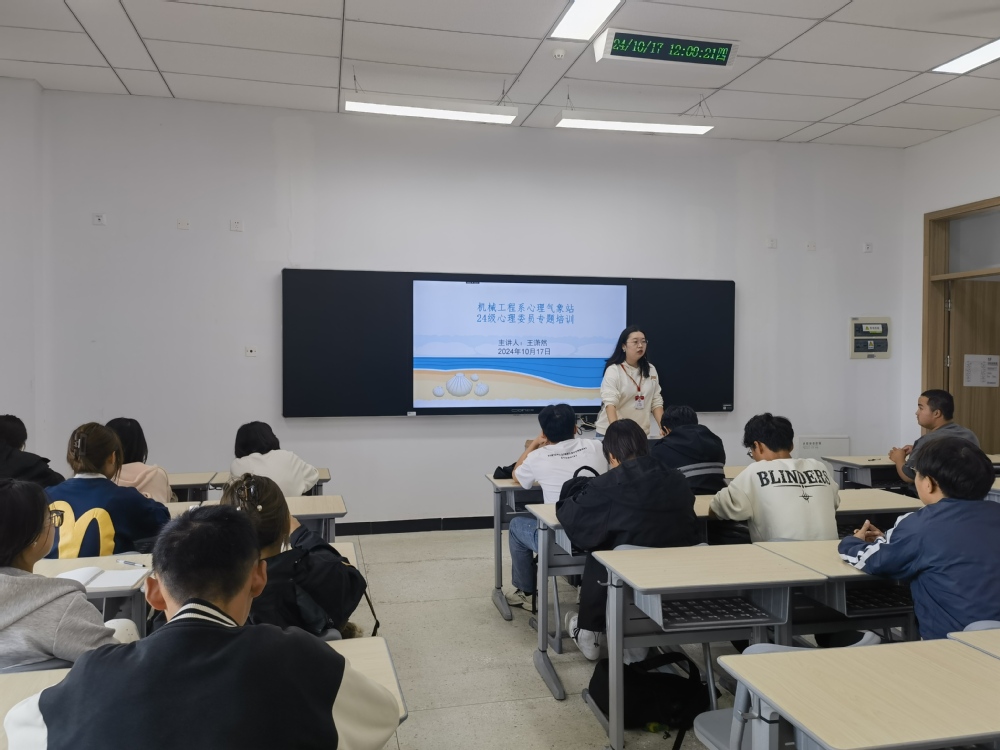 为进一步提升我系心理健康教育工作育人实效,充分发挥四级预警协调机制作用,2024年10月17日,机械工程系心理气象站在思学楼108开展了2024级新生心理委员入职培训,此次培训由我系心理气象站站长王潇然老师主持,24级各班新任心理委员全部参加。