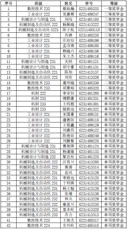 为激励在校大学生勤奋学习,努力进取,在德、智、体、美、劳等方面得到全面发展,同时也为了资助在校品学兼优的学生顺利完成学业,根据教育部、财政部及省教育厅、财政厅国家奖助学金相关管理规定和《米兰官方网页版奖学金评选及管理办法》(南机电院学〔2023〕23号)要求,机械工程系认真组织评选工作,经过本人申请,班级评议,现将2023-2024学年米兰官方网页版奖学金公示如下:
