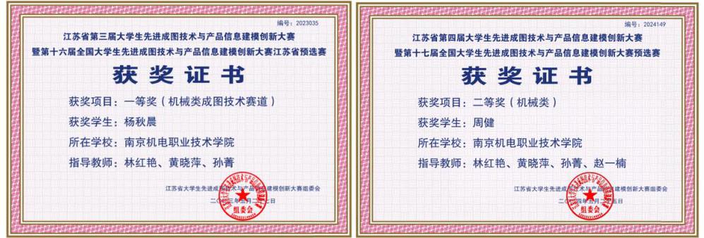 2020年参加中国大学生机械工程创新创意大赛,获得三等奖1次;2021年参加“西门子杯”中国智能制造挑战赛,获得三等奖2次;2022年参加“江苏工匠”智能装备数字化技术应用竞赛决赛,获得一等奖1次、二等奖1次;2024年参加中国工装设计大赛,获得三等奖1次。