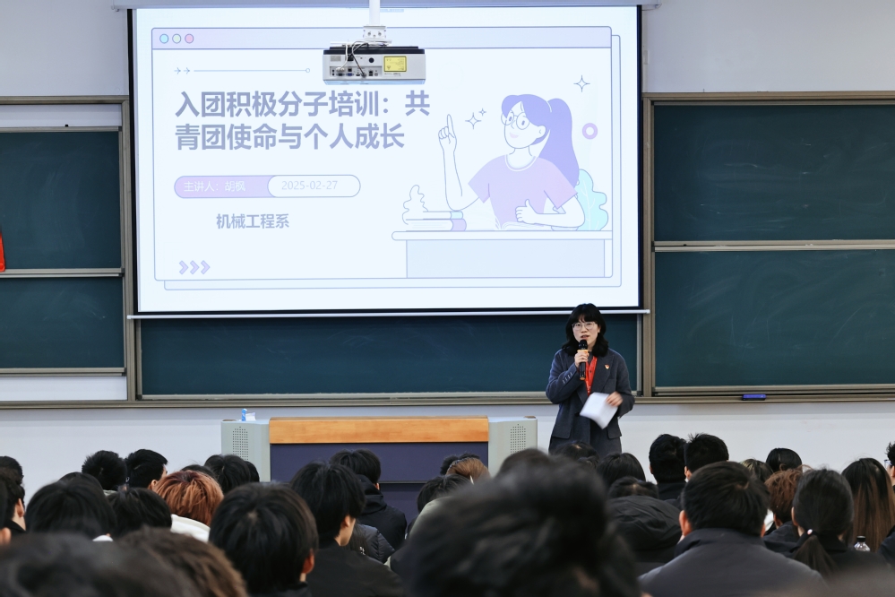 为强化党对共青团的引领作用,促进青年学子在团组织中汲取成长力量,2025年2月27日,机械工程系于善学楼101教室成功开展“党建带团建——党支部书记讲团课”活动。机械工程系党支部书记胡枫担任主讲人,机械工程系团委书记王晨歌、系团委学生干部以及180名入团积极分子参加活动。
