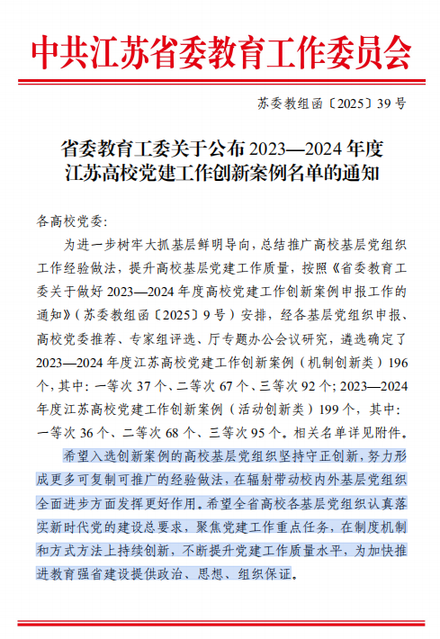 喜报:机械工程系党支部项目获评2023-2024年度江苏高校党建工作创新案例