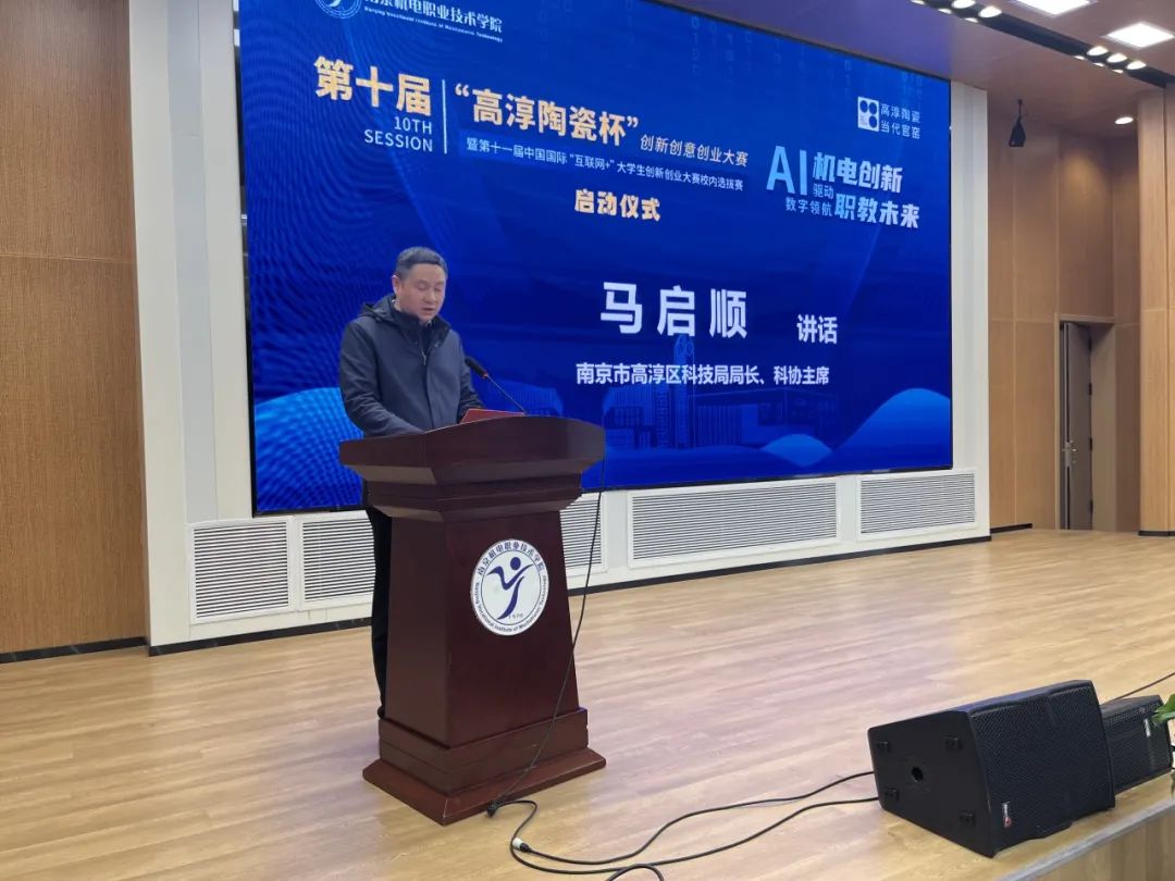 2025年3月18日,“AI驱动机电创新,数字领航职教未来”米兰官方网页版第十届“高淳陶瓷杯”创新创意创业大赛暨第十一届中国国际“互联网+”大学生创新创业大赛校内选拔赛启动仪式在乐学楼102报告厅举行。南京市高淳区科技局局长、科协主席马启顺,南京高淳高新技术产业开发区管理办公室分管负责人倪友谊,南京高等职业教育创新创业园发展服务中心主任吴凯,江苏高淳陶瓷股份有限公司党委副书记、副总经理周玉明,学校党委委员、副校长刁爱军等领导出席启动仪式。300余名师生代表参加活动,共同见证大赛开幕。