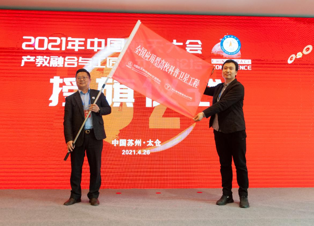 2021年4月26日,我校成功协办2021中国航天大会产教融合与工匠人才发展论坛。仪式上,我校周庆礼书记与中国航天科技国际交流中心周岫彬主任共同启动了全国应用型高校科普卫星工程。随后,航天科技集团科技委郭玉明主任将全国应用型高校科普卫星工程的旗帜授予我校,标志着全国应用型高校科普卫星工程正式拉开帷幕。
