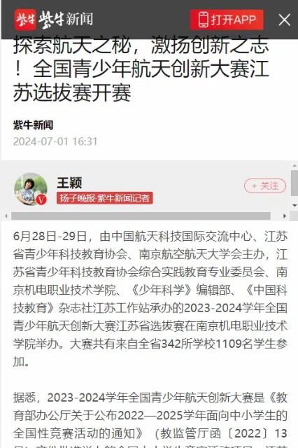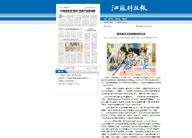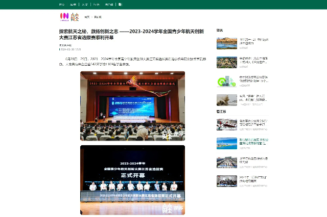 2023-2024学年全国青少年航天创新大赛江苏省选拔赛在我校的成功举办,标志着我校在青少年科技人才培养与科普教育领域的又一重要突破,更是我校教育历程中一个闪耀的里程碑。时代洪流滚滚向前,科技之树常青,创新与技术创造的浪潮正以前所未有的势头席卷而来,其中,航空航天科技的日新月异尤为瞩目,它如同璀璨的星辰,引领着人类社会向未知的宇宙深处勇敢探索。本次大赛的举办激发了无数青少年的航天梦想与创新激情,鼓励他们以无畏的勇气、饱满的热情,在航天科技的浩瀚星海中扬帆起航,不懈追求。青少年,作为国家的明日栋梁与希望之光,承载着推动社会进步与科技创新的历史使命。少年者,人生希望,人生之春,广大青年应当勇于探索,勇于创新,为国家的繁荣富强贡献自己的力量。随着2024年6月29日大赛的成功举办,其影响力迅速跨越校园界限,成为社会各界尤其是主流媒体争相报道的热点。从多维度、广视角出发的深入报道,不仅全面展现了赛事的精彩瞬间与青少年的卓越风采,更在全社会范围内再次点燃了人们对航天科技及宇宙奥秘的浓厚兴趣与无限遐想。