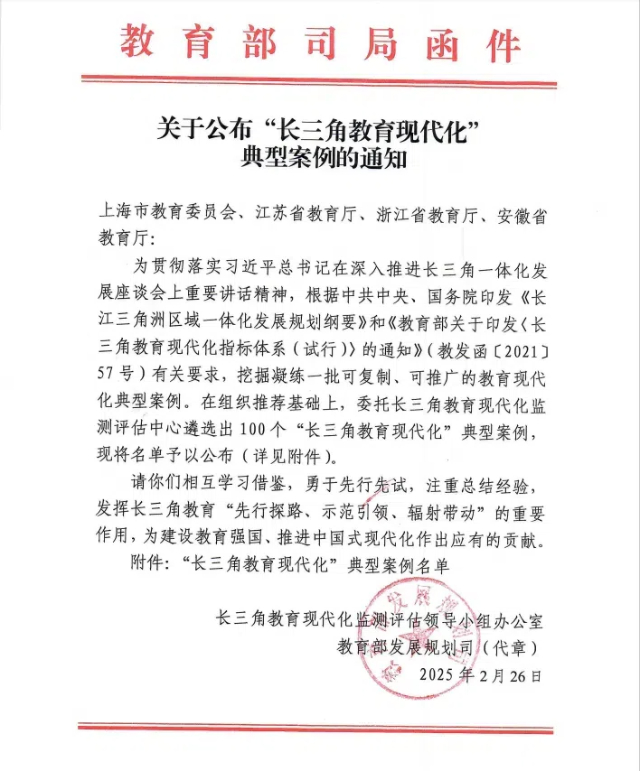 此次评选旨在贯彻落实习近平总书记在深入推进长三角一体化发展座谈会上重要讲话精神,挖掘和凝练一批可复制、可推广的教育现代化典型案例。我校的入选,不仅彰显了学院在教育现代化方面的卓越成就,也体现了其在航天特色创新教育与实践领域的深厚底蕴和独特优势。