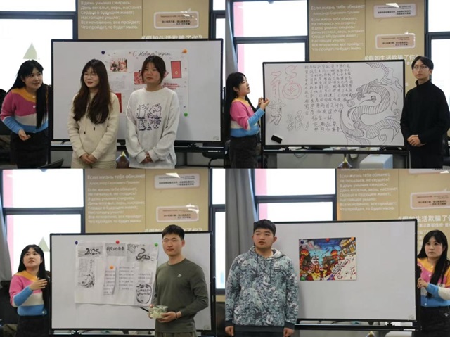 为了确保这次线上交流课堂的顺利进行,双方学校的学生都提前做了充分的准备:查阅典故、绘制海报、制作道具、录制视频等。课堂上,同学们分享了各自国家新年的由来、传统、特色食物、风俗等,并展开了热烈的讨论。