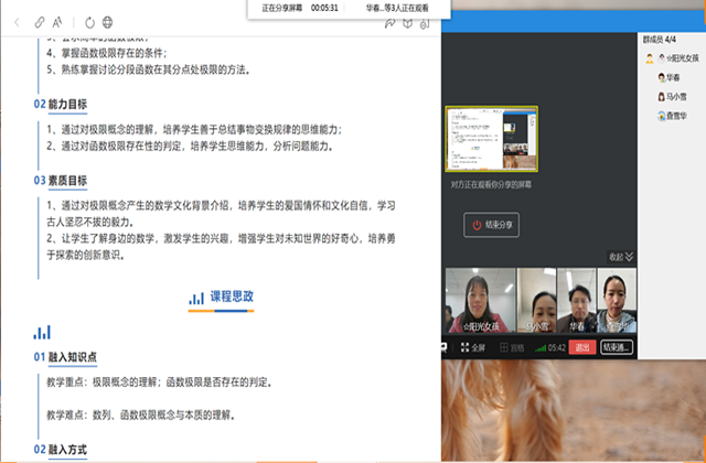 首先,马小雪老师带领全体老师学习了《高等数学》课程的教学目标:1、知识目标2、能力目标3、素质目标。从知识的讲授到能力的提高再到素质的提升,这是一个质的飞跃。