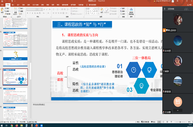 通过本次教研会议,第一,各位老师对课程思政有了更深入的思考,对专业课程思政矩阵图进行了完善;第二,各位老师认为后期应当定期开展课程思政经验方法的交流;第三,专业课程老师应当加强教学与学工的联动,以实现立德树人,做到“育人”先“育德”,注重传道授业解惑、育人育才的有机统一。