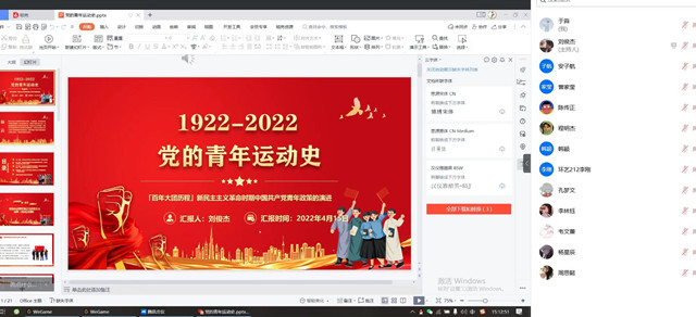 回望百年,青春向党,每一次搏击风浪的天空下,都激荡着青春的旋律;每一个勇毅前行的足迹中,都饱含着奋斗的艰辛。为深入学习贯彻习近平总书记关于青年工作的重要思想,团结引领广大团员青年永远跟党走、奋进新征程,以实际行动迎接党的二十大胜利召开,4月中下旬,人文社科系团总支组织各班级团支部开展了“喜迎二十大、永远跟党走、奋进新征程”主题教育实践活动之“党领导下的中国青年运动史”团课专题学习活动。