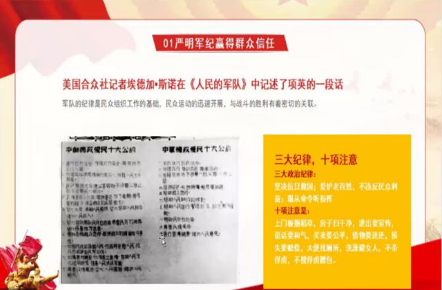 党课首先介绍了新四军群众路线的概况,分析了新四军贯彻群众路线的必要性,最后介绍了新四军贯彻群众路线的具体实践。在课程中杨老师结合学院地处高淳特有的丰富红色资源,加入了大量高淳地区鲜活的史实和生动的事例,充分说明了我们党的最大政治优势是密切联系群众,而当前我们党最大的危险是脱离群众。