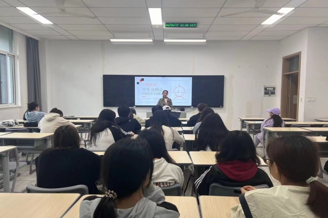 会议伊始,学生会主席杨闪悦上台发言,主要针对换届竞选的注意事项展开,分为部门职能和竞选材料二个部分进行讲解。并对本月的活动做出安排,鼓励学生会成员积极参与,助系发展。