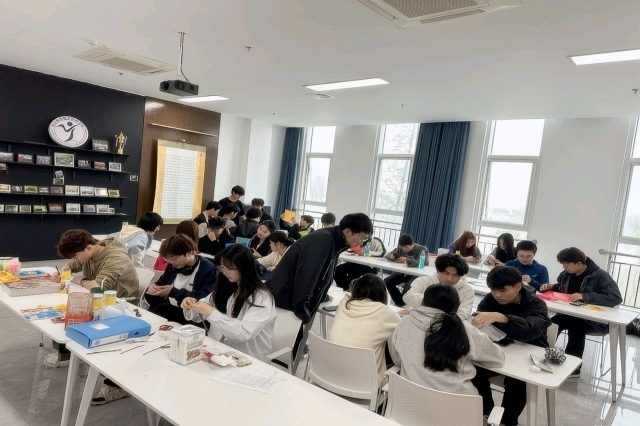 以诗词画卷为依,呈多彩校园。人文社科系环境艺术设计专业的同学们带领着大家一起集思广益,合理规划设计,将这些精美的手工艺品放置在校园的各个角落,共同构筑了一幅栩栩如生的校园文化画卷。飞花令灯笼、竹筒风铃、彩色飞花令牌等作品,如同春天的花朵般点缀着校园,为校园的每个角落带来了生机与活力。随着微风轻拂,竹筒风铃悦耳的声音,飞花令灯笼摇曳的身姿,飞花令牌舞动的诗意,无一不在诉说着诗词的韵味和魅力。每一处风景都如同一首优美的诗篇,让人流连忘返,沉醉其中。