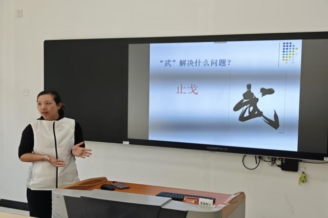 会上,俞老师首先介绍了高校武术课程相关的武术基础知识。她提出要立足于高校武术课程,通过明晰武术特点、确定课程定位以及遵循课程规律来挖掘武术课程思政元素的策略。她还阐述了从课前优化课程设计、课中细化课程实践到课后强化课程反思,以实现武术课程思政元素与武术教学融合的方法。