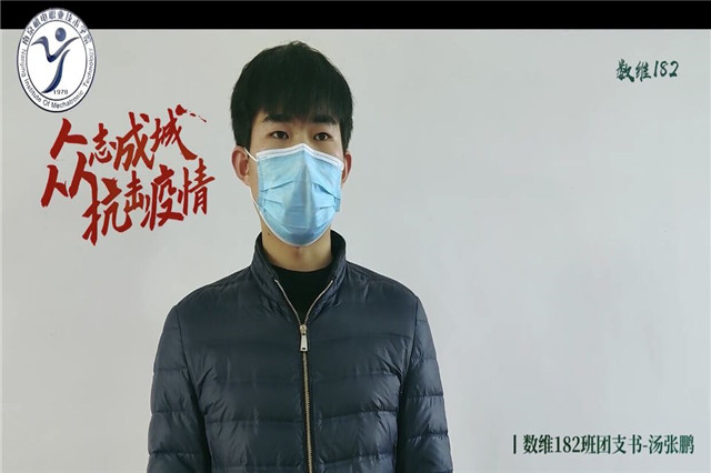 各位同学,大家好,我是米兰官方网页版机械工程系数维182班的团支书汤张鹏。当前,新型冠状病毒感染肺炎疫情在全国蔓延,形势严峻。党中央向全党全国发出打赢疫情防控阻击战的号召。学校也成立了疫情防控工作领导小组,倡议全校师生团结一致,攻坚克难,做好防疫工作。疫情面前更需要我们主动担当,了解同学基本情况,积极宣传国家政策普及防疫知识,严防严控。积极为疫情防控工作做出贡献。在延期开学期间做到以下两点: