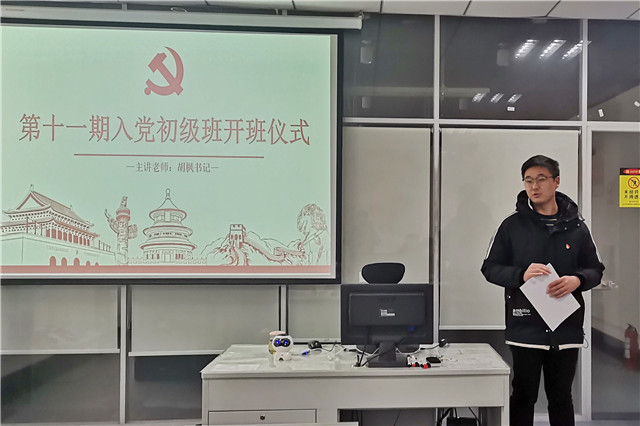 会议由团总支书记于宇老师主持,伴随着国歌的奏响,第十一期初级党课班开班典礼正式拉开帷幕。首先由胡枫老师讲话,她对同学们提出了三个要求:"实学、实求、实干”。并且为大家制定了党课初级班的签到和上课要求。